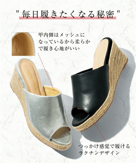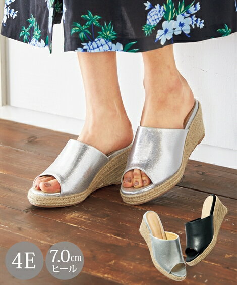 サンダル 大きいサイズ レディース ジュート ウェッジ ミュール 低反発中敷 ワイズ4E 靴 シルバー/黒 26.0〜26.5cm ニッセン