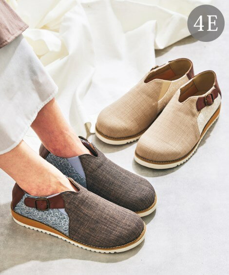 シューズ カジュアル 大きいサイズ レディース つま先 ゆったり かかとが踏める レース 低反発中敷 ワイズ4E グレー×アイボリー/黒 25.0〜25.5cm ニッセン